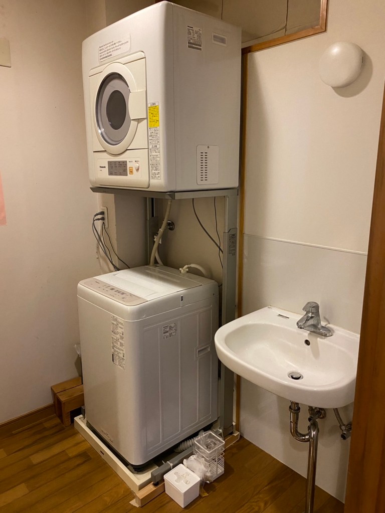 washing machine, vacuum cleaners, clothes dryer, iron, laundry rack, futon dryer, refrigerator, microwave, toaster, a set of kitchen tools, a whole set of tableware, extra bed linens and towels